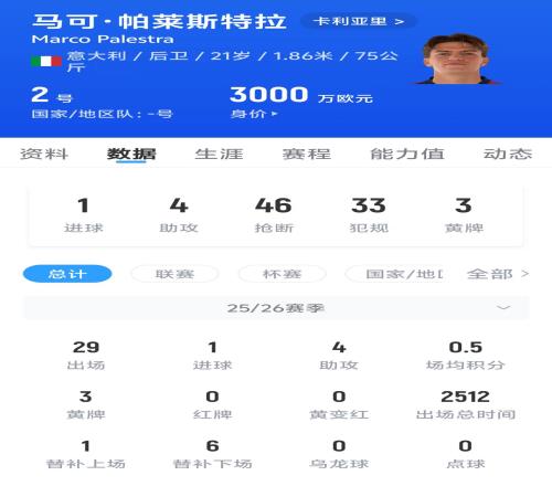 帕莱斯特拉目前为意甲球队卡利亚里出场29次,贡献1球4助攻,目前身价3000万欧元。